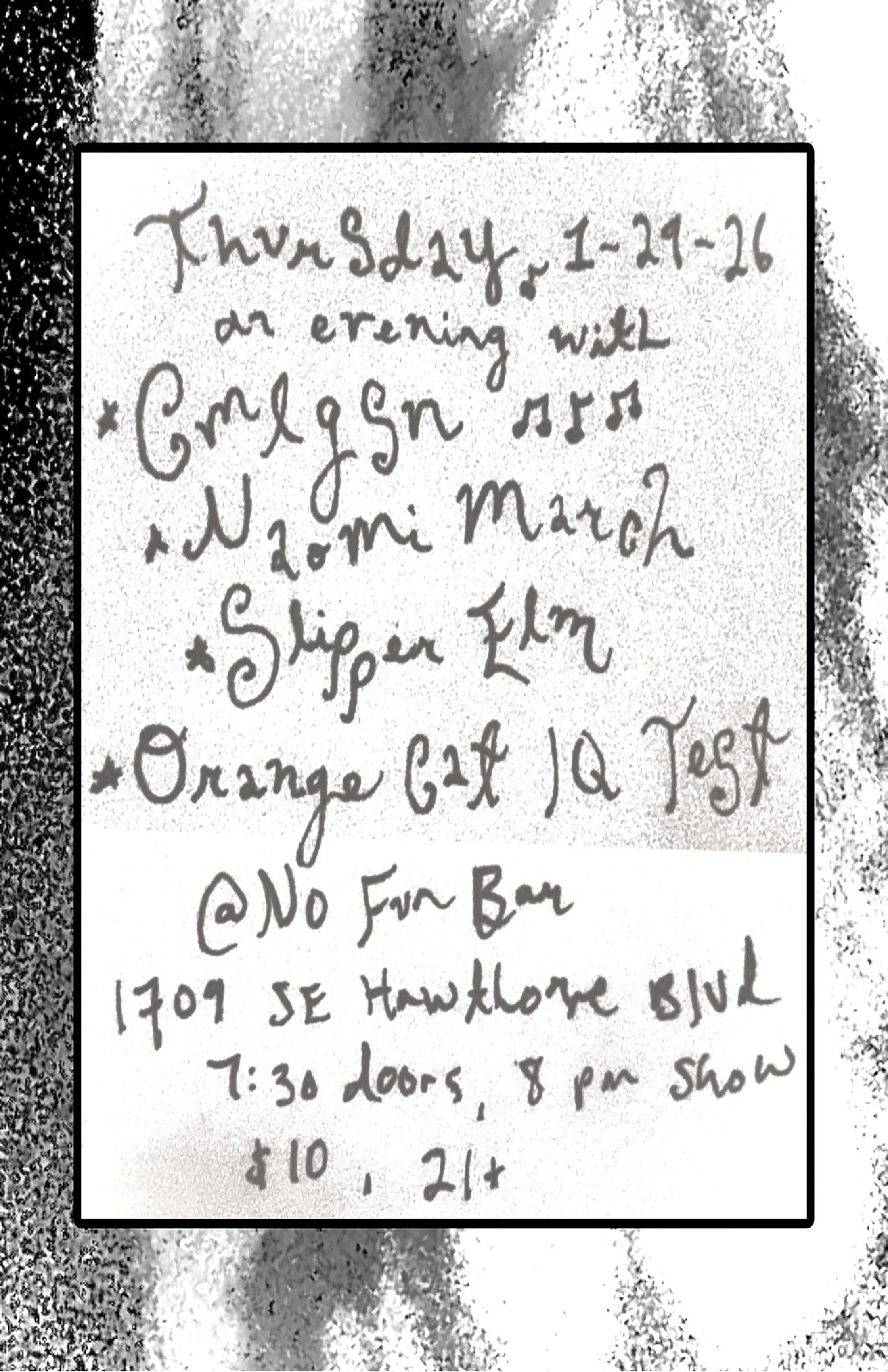 01/29 ORANGE CAT IQ TEST, SLIPPER ELM, NAOMI MARCH, CMLGSN - No Fun - 21+, 7:00pm, $10