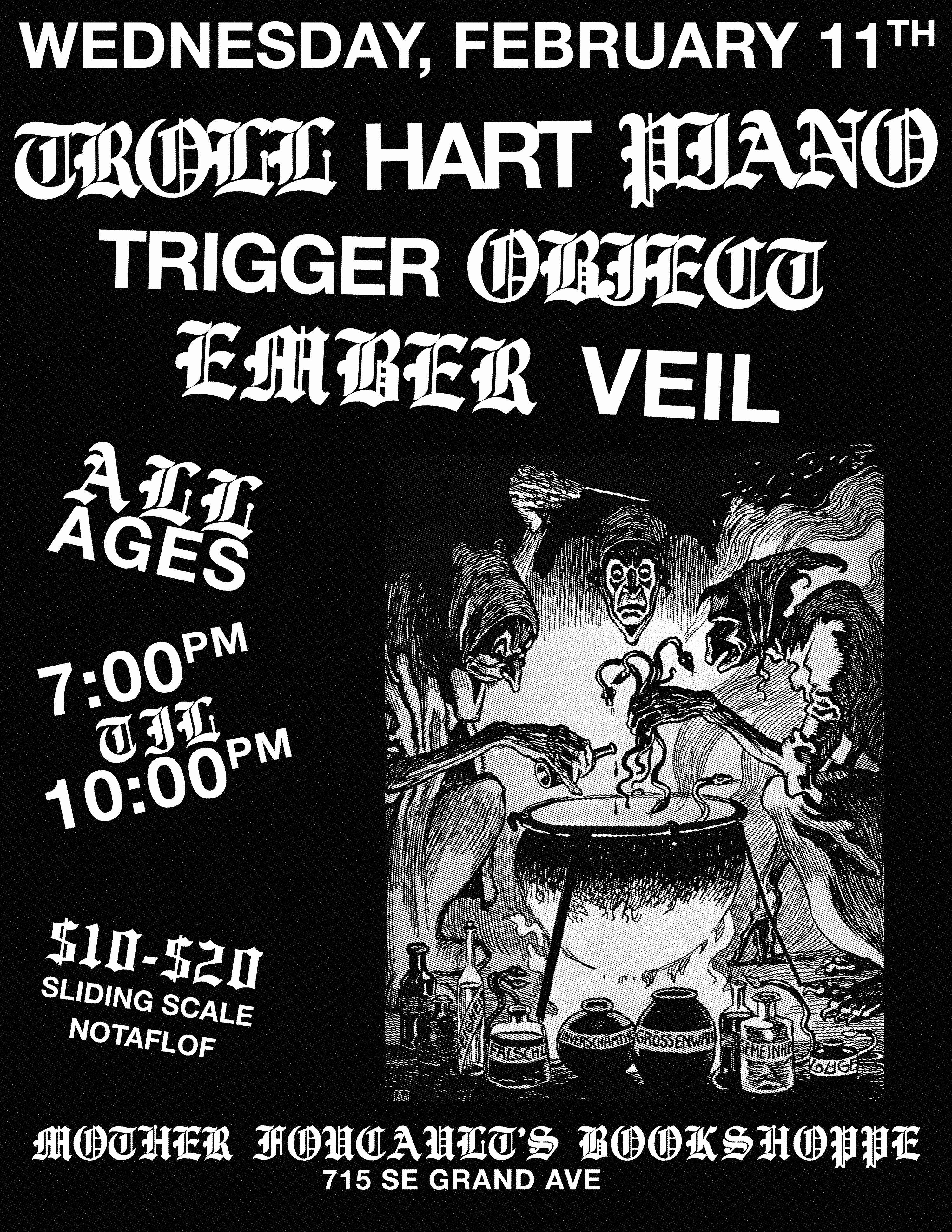 02/11 Troll Hart Piano, Trigger Object, Ember Veil - Mother Focault's Bookshop - All Ages, 7:00pm, $10-$20 Sliding Scale NOTAFLOF