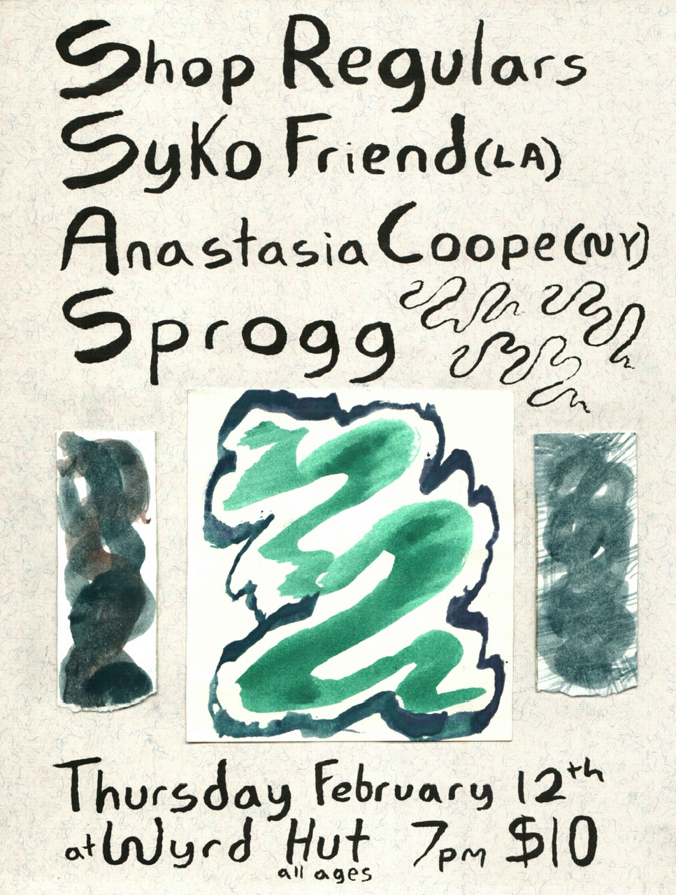 02/12 Shop Regulars, Syko Friend, Anastasia Coope, Sprogg - Wyrd Hut - All Ages, 7:00pm, $10