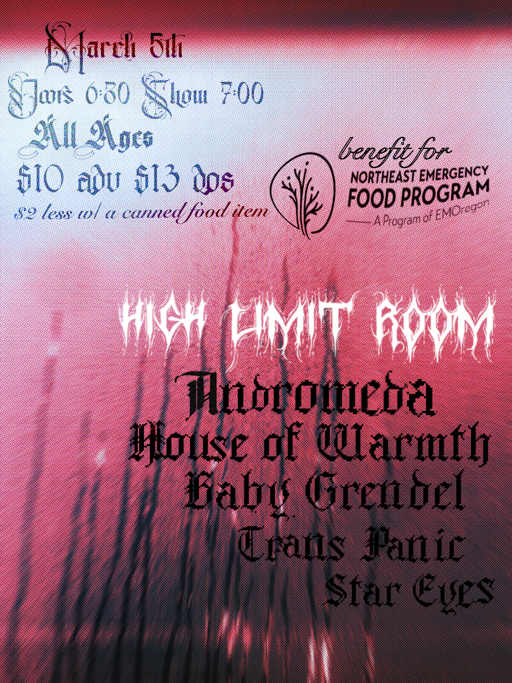 03/05 Benefit for Northeast Emergency Food Program - Andromeda, House of Warmth, Baby Grendel, Trans Panic, Star Eyes - High Limit Room - 21+, 8:00pm, $10/$13 ($2 less with canned food item)