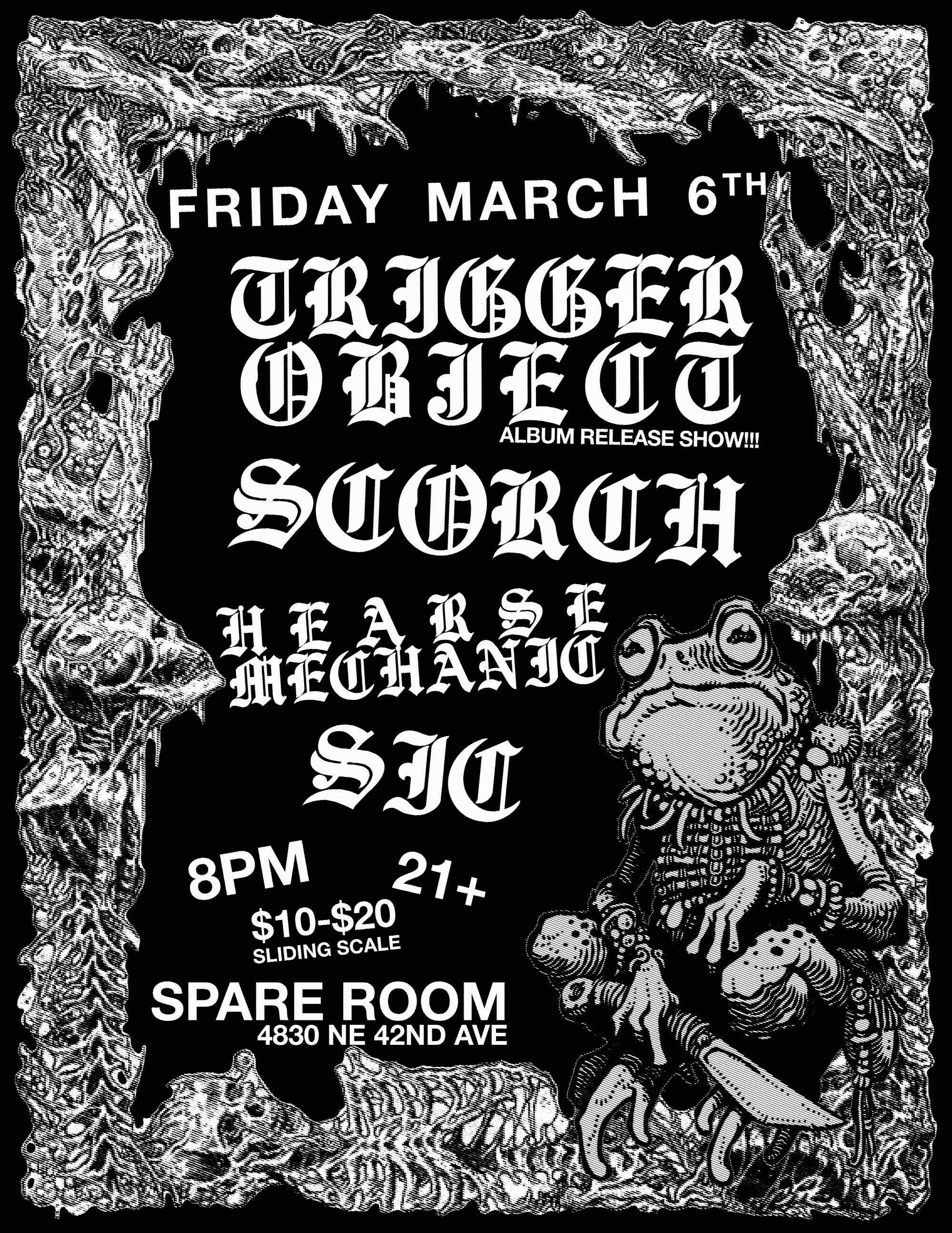 03/06 Trigger Object (Album Release Show) Hearse Mechanic, Scorch, Sic - Spare Room - 21+, 8:00pm, $10-$20 Sliding Scale