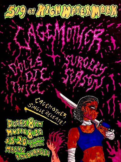 05/09 Cage Mother, Dolls Die Twice, Surgery Season - High Water Mark Lounge - 8:00pm - 21+, $5-$20 sliding scale, Masking Encouraged