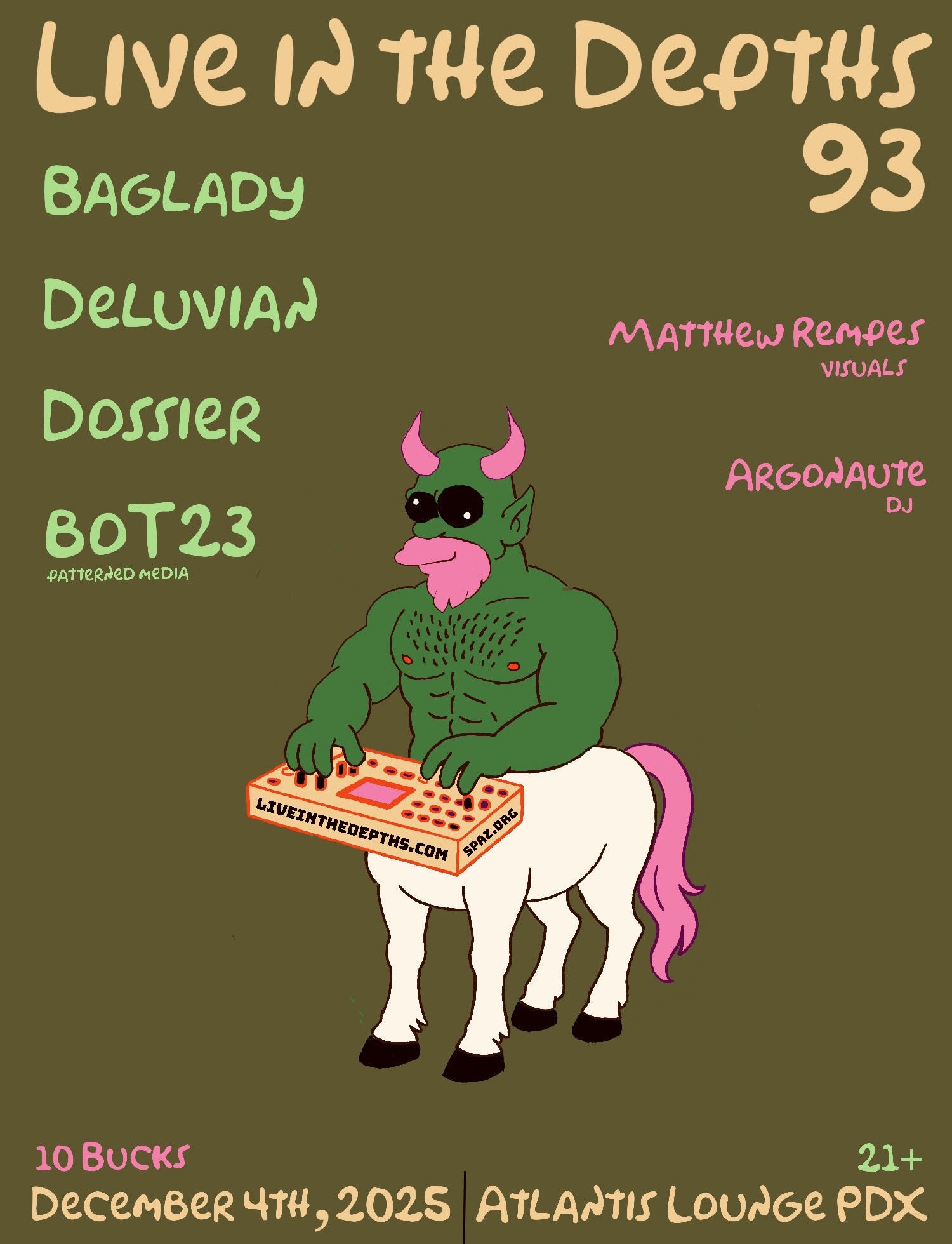 12/04 Live in the depths 93 - Baglady, Deluvian, Dossier, BOT23 - Atlantis Lounge - 21+, 7:00pm, $10