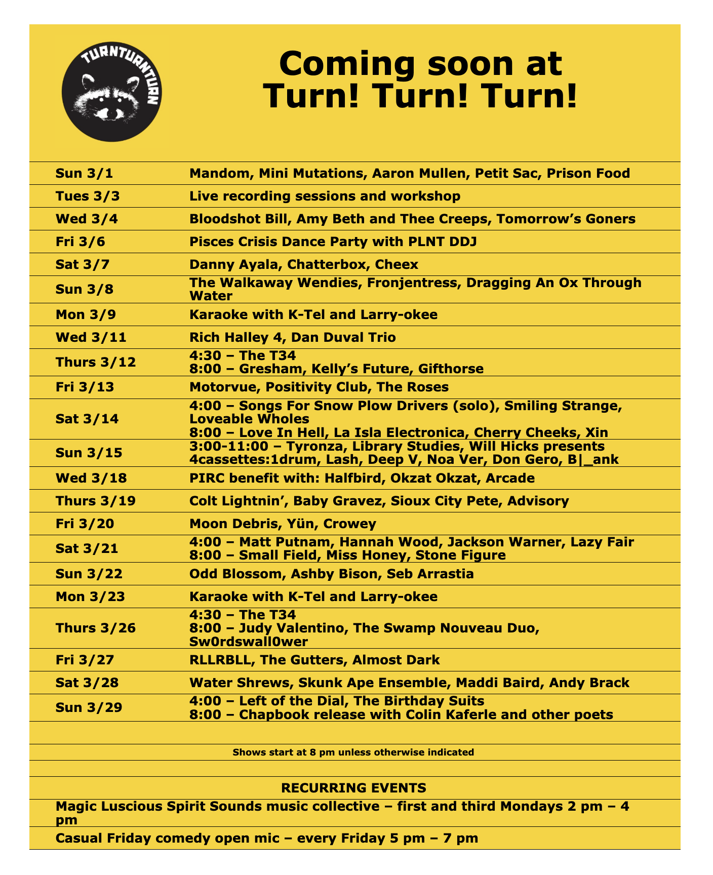 You have happened upon a big friendly pile of SHOWS AND EVENTS AND OTHER THINGS in order of date! Some flyers might not load, simply hit refresh and give it a sec - this here old school website has some old school quirks.