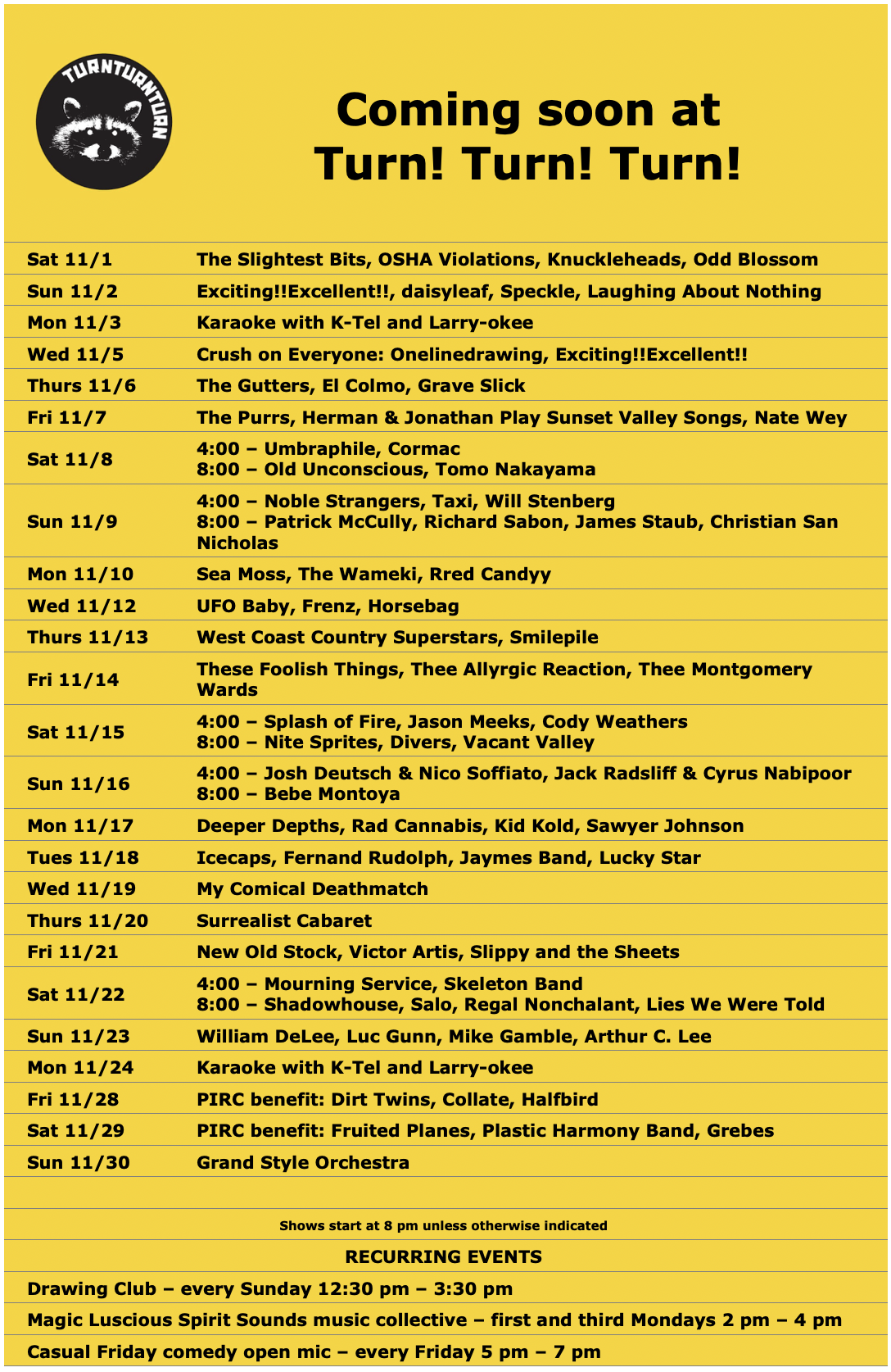 11/28 - 11/29 PIRC BENEFIT - 11/28 Dirt Twins, Collate, Half-Bird - 11/29 Plastic Harmony Band, Fruited Planes, Grebes Ghost Valley - Turn! Turn! Turn! - 21+, 8:00pm, $10